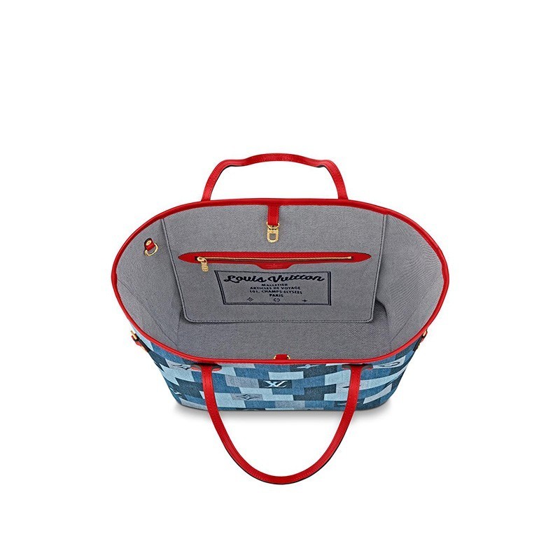 This edition of the legendary Neverfull tote looks fresh and fashionable, dressed in a patchwork of denim-blue hues. The pattern combines Damier with Monogram motifs, expertly printed on the canvas to give the illusion of texture and volume. Handles and side laces made of brilliant red leather enhance the crafted look of this versatile signature bag.Detailed Features12.20 x 11.22 x 6.69 inches(Length x Height x Width)
